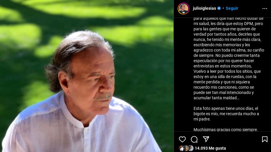 “Estoy muy preocupado por todo lo que causa el haber elegido un pequeño tiempo de soledad. De una manera mal educada para aquellos que han hecho dudar de mi salud, les diría que estoy DPM, pero para las gentes que me quieren de verdad por tantos años, decirles que nunca he tenido mi mente más clara, escribiendo mis memorias y les agradezco con toda mi alma, su cariño de siempre”, escribió Iglesias en una publicación en Instagram que acompañó con una foto suya que, según dijo, es la última que se tomó.