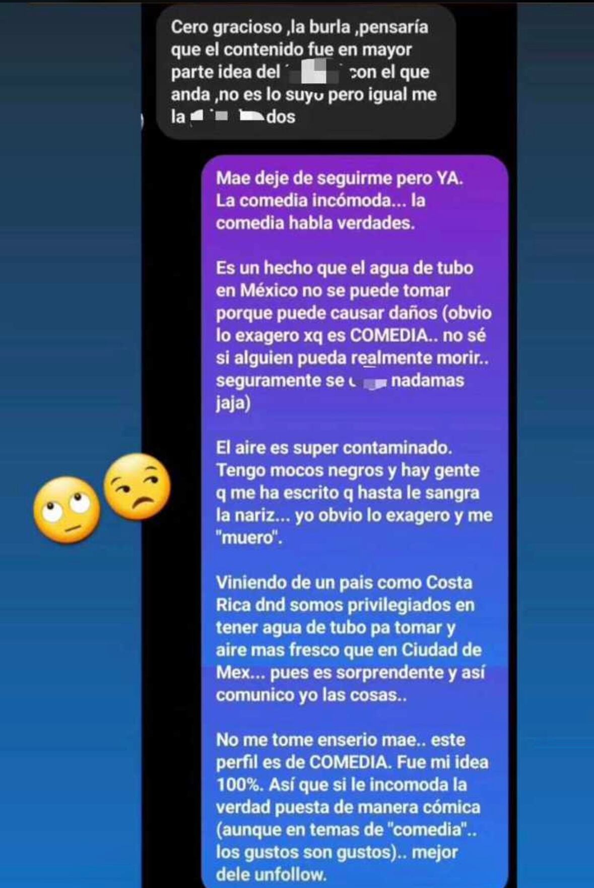 “Yo lo exagero y me ‘muero’. Viniendo de un país como Costa Rica donde somos privilegiados en tener agua de tubo para tomar y aire más fresco que en Ciudad de México, pues es sorprendente y así comunico yo las cosas”, escribió Renzo.