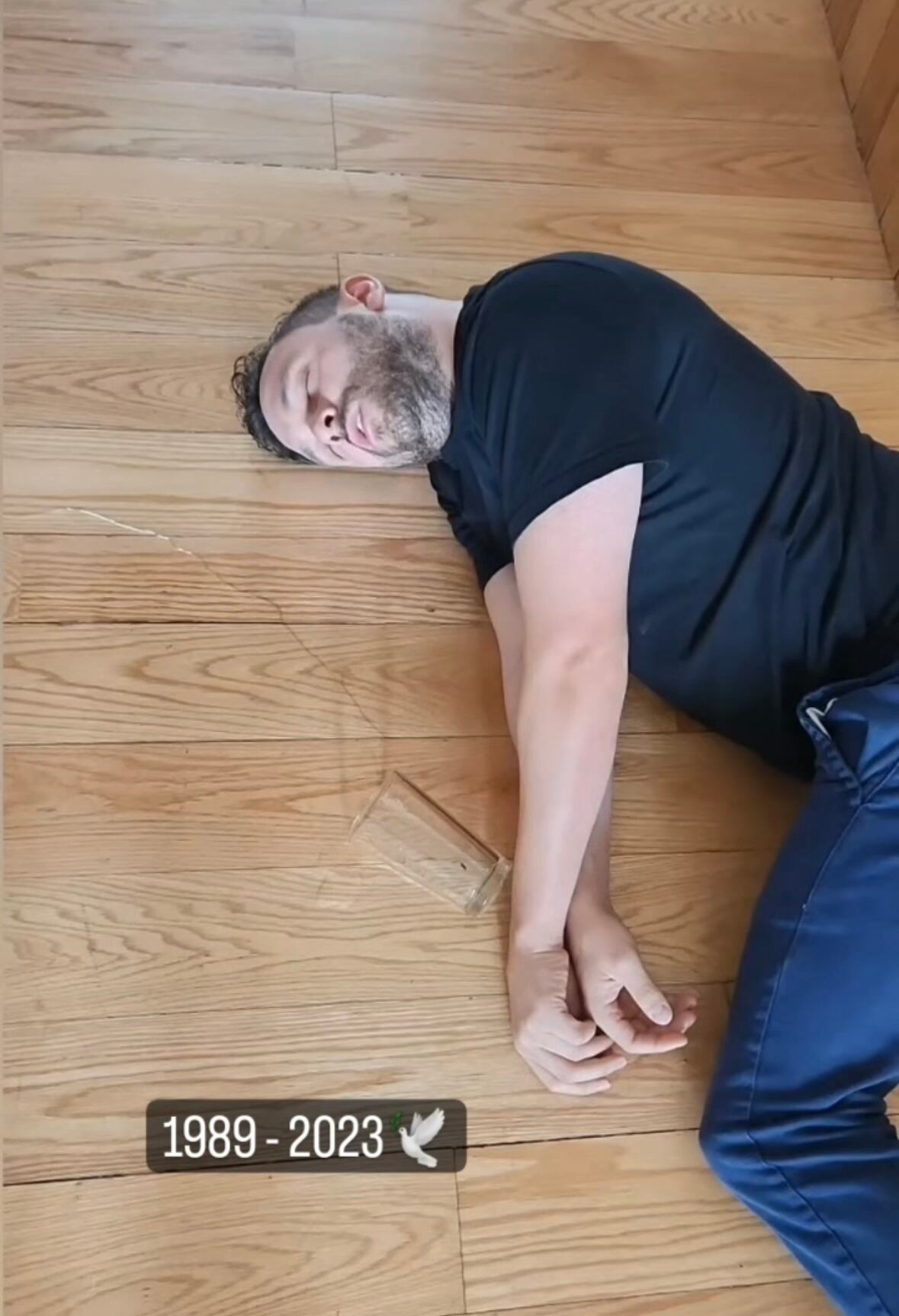 “Nada como empezar el día con un vasito con agua, vamos a ver que nos trae México, México”, después sale tirado en el piso (como fallecido), y escribió “1989-2023″, con una música de fondo instrumental.