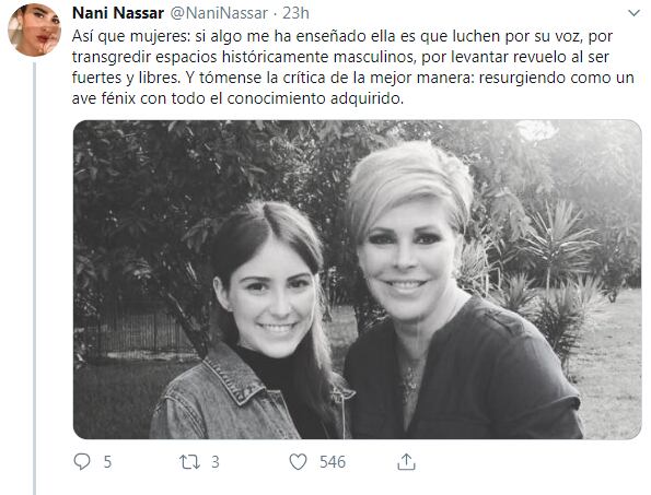 Ella también agregó: “Y ahora ma, después del escrutinio público tan heavy que sufrió, se ríe de todo lo que pasó, me enseña los memes y nos reímos juntas. Nunca he conocido una mujer más breteadora y empoderada como ella. Así que mujeres: si algo me ha enseñado ella es que luchen por su voz, por el transgredir espacios históricamente masculinos, por levantar revuelo al ser fuertes y libres, y tomarse la crítica de la mejor manera: resurgiendo como un ave fénix con todo el conocimiento adquirido”.