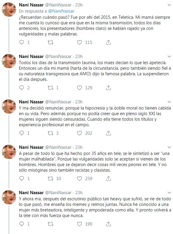 “Todos los días de la transmisión taurina, los maes decían lo que les apetecía, entonces un día mi mamá, harta de la circunstancia, pero también siendo fiel a su naturaleza transgresora que amo, dijo la famosa palabra. La suspendieron el día después y ma decidió renunciar porque la hipocresía y la doble moral no tienen cabida en su vida, pero además porque no podía creer que en pleno siglo XXI las mujeres siguen siendo censuradas, cuando ella tiene todos los títulos y experiencia profesional en el campo”, escribió.