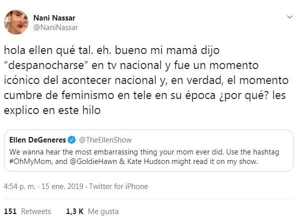 “Hola Ellen, ¿Qué tal? Eh. Bueno, mi mamá dijo ‘despanocharse’ en tv y fue un momento icónico del acontecer nacional y, en verdad, el momento cumbre de feminismo en tele en su época. ¿Por qué? Les explico en este hilo”, escribió Nani Nassar en sus redes sociales.