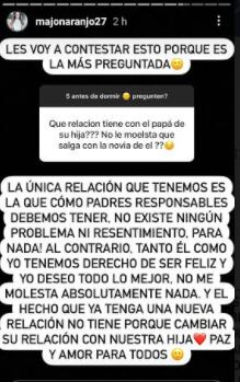 “La única relación que tenemos es la que como padres responsables debemos tener. No existe ningún problema ni resentimiento, para nada. Al contrario, tanto él como yo tenemos derecho de ser felices y le deseo todo lo mejor, no me molesta absolutamente nada. Y el hecho que ya tenga una nueva relación no tiene por qué cambiar su relación con nuestra hija. Paz y amor para todos”, escribió Majo.