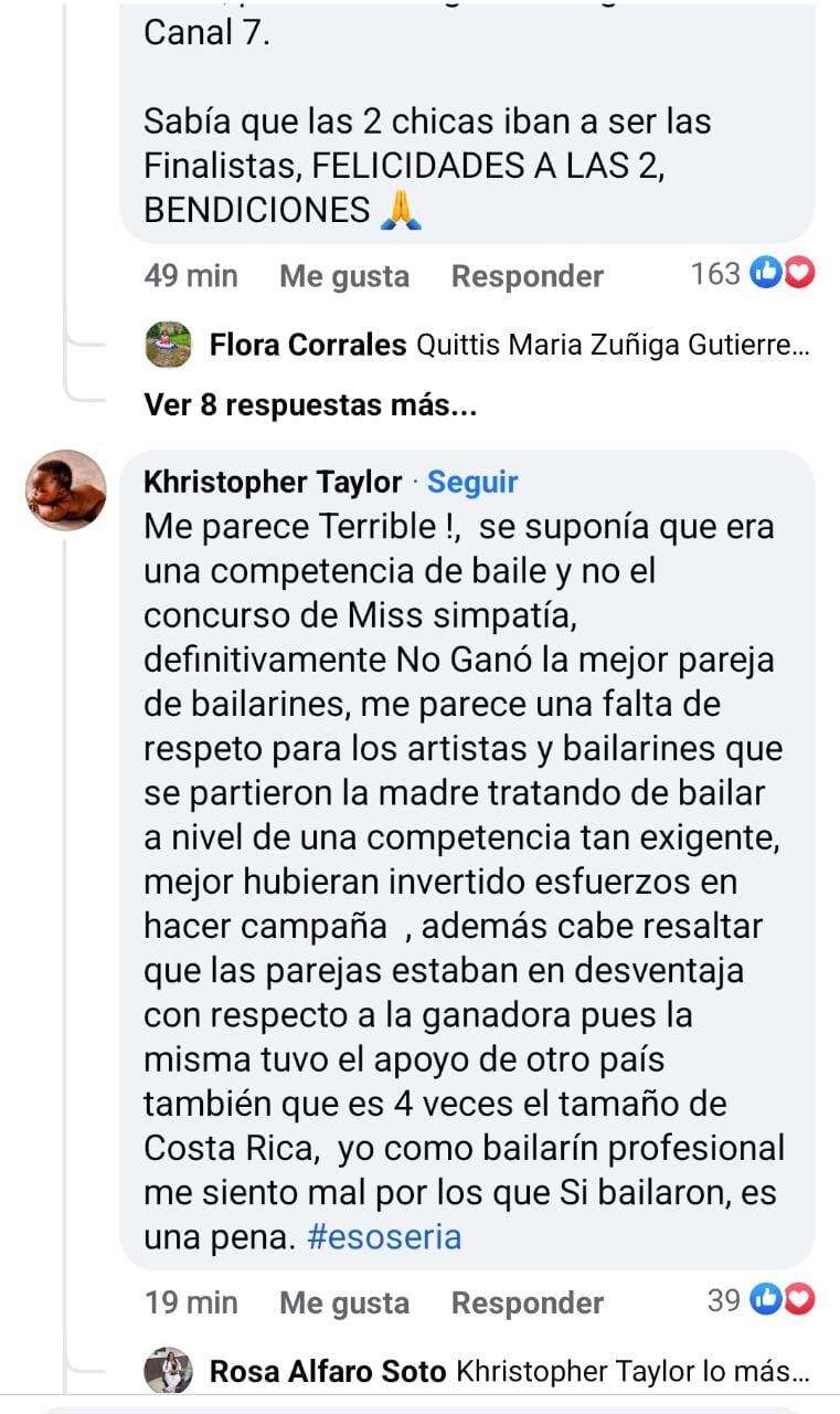 “Cabe resaltar que las parejas estaban en desventaja con respecto a la ganadora pues la misma tuvo el apoyo de otro país que es cuatro veces el tamaño de Costa Rica, yo como bailarín profesional siento pena por los que sí bailaron, es una pena”, escribió Taylor, con el hígado en la mano.