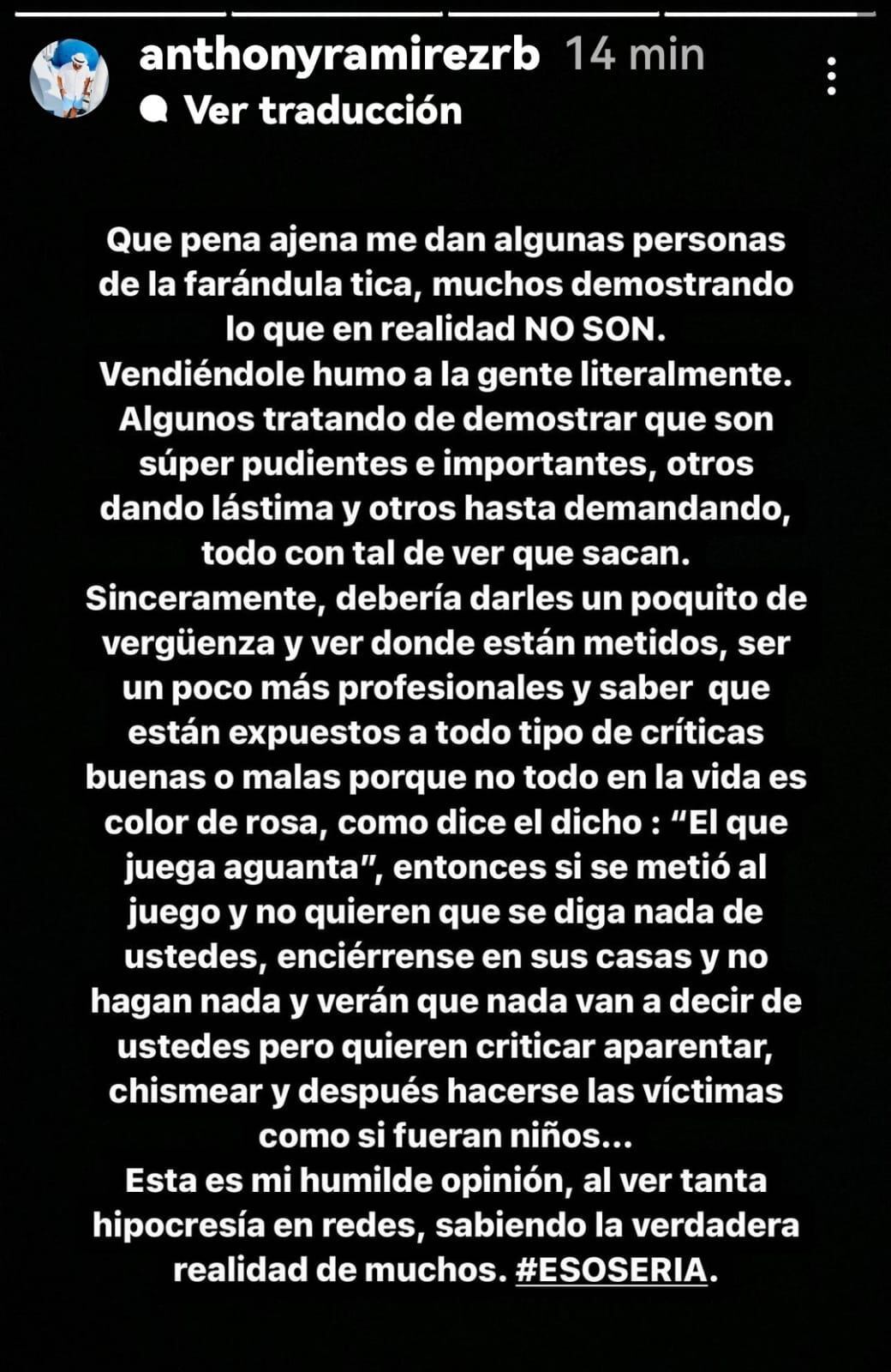 Anthony empezó escribiendo: “Qué pena ajena me dan algunas personas de la farándula tica, muchos demostrando lo que en realidad no son, vendiendo humo a la gente literalmente, algunos tratando de demostrar que son superpudientes e importantes, otros dando lástima, y otros hasta demandando, todo con tal de ver qué sacan”.