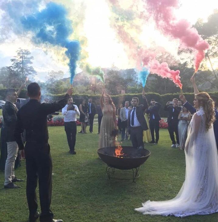 Nela, como es conocida la expresentadora, junto a su media naranja y algunos de sus acompañantes dieron varias vueltas a una fogata mientras el color de los polvos holi los cubría.