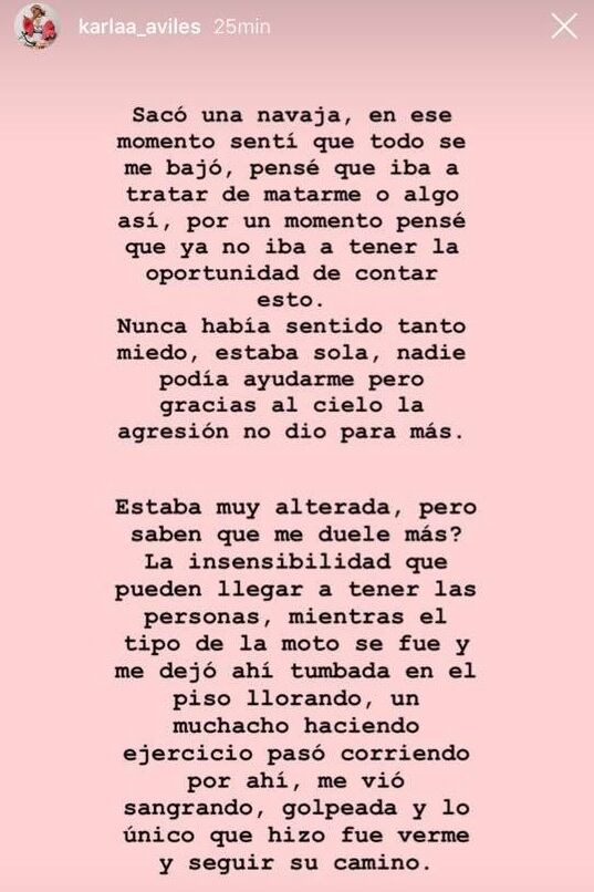 “Estaba muy alterada, pero saben qué me duele más… la insensibilidad que pueden llegar a tener las personas. Mientras el tipo de la moto se fue y me dejó ahí tumbada en el piso, llorando; un muchacho pasó haciendo ejercicio por ahí, me vio sangrando, golpeada y lo único que hizo fue verme y seguir caminando”, escribió.