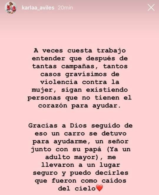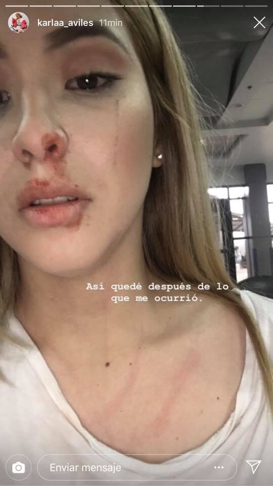 Avilés contó en Instagram, donde tiene casi 30 mil seguidores, que un sujeto la acorraló contra la pared y la golpeó en la cara.
