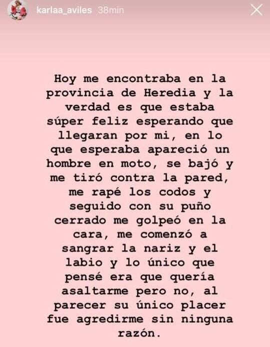 “Esperando que llegaran por mí, apareció un hombre en moto, se bajó y me tiró contra la pared. Me raspé los codos y seguido, con su puño cerrado, me golpeó en la cara. Me comenzó a sangrar la nariz y el labio y, lo único que quería asaltarme, pero no, al parecer su único placer fue agredirme sin ninguna razón”, contó la expresentadora de Teletica.