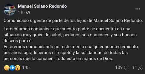 “Lamentamos comunicar que nuestro padre se encuentra en una situación muy grave de salud, pedimos sus oraciones y sus buenos deseos para él. Estaremos comunicando por este medio cualquier acontecimiento, por ahora, agradecemos el respeto y la solidaridad de todas las personas que lo conocen. Todo está en manos de Dios”, se lee en una publicación reciente.