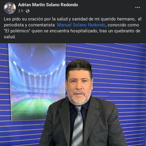 La familia del periodista y comentarista deportivo Manuel Solano está a la espera de un milagro de Dios en la salud del comunicador.