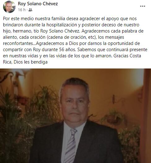 “Por este medio nuestra familia desea agradecer el apoyo que nos brindaron durante la hospitalización y posterior deceso de nuestro hijo, hermano, tío Roy Solano Chévez. Agradecemos cada palabra de aliento, cada oración (cadena de oración, etc.), los mensajes reconfortantes”.