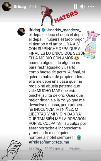 Frida reiteró que no le importan las propiedades, y aunque hizo mención de una supuesta casa que su mamá le debe, señaló que mejor primero le devuelva algo más preciado que perdió por su culpa, como su inocencia y su virginidad.