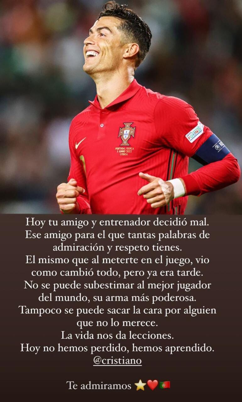 Por medio de una historia en Instagram, le contó a sus millones de seguidores lo que sintió al ver a CR7 empezar desde la banca un juego tan importante.