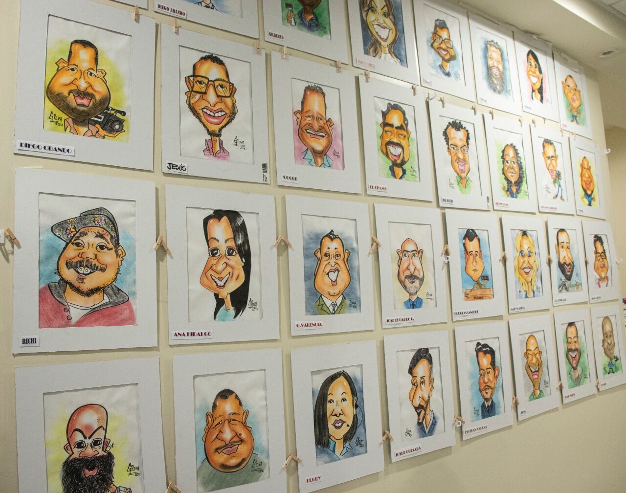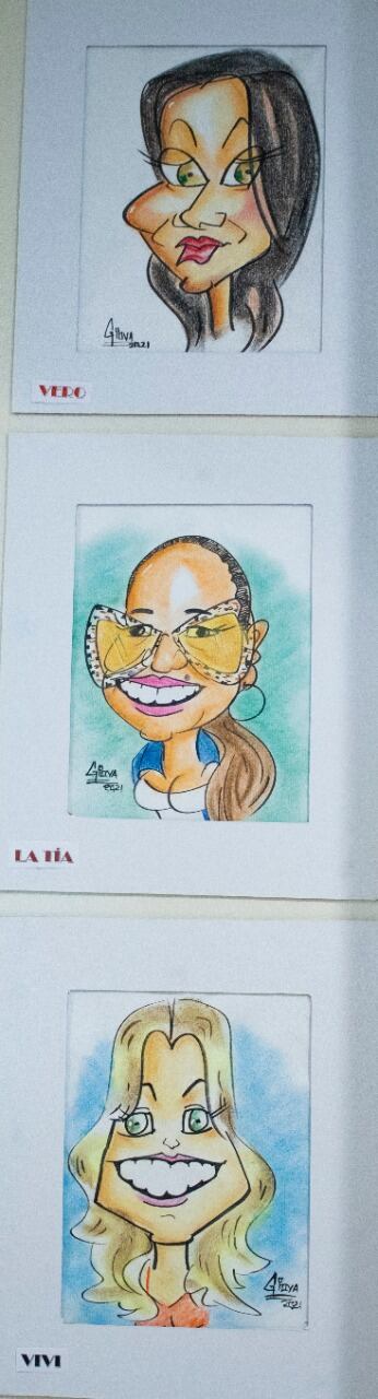 Giova inauguró su colección de caricaturas de los diferentes “personajes” del canal, iniciando por las divas, Verónica González, Maureen Salguero y Viviana Calderón; pasando por periodistas, camarógrafos, productores, personal de seguridad y hasta gerentes de Multimedios.