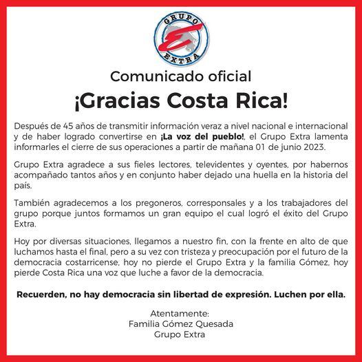 “Después de 45 años de transmitir información veraz a nivel nacional e internacional, el Grupo Extra lamenta informarles el cierre de sus operaciones a partir de mañana 01 de junio del 2023. Hoy por diversas situaciones llegamos a nuestro fin, con la frente en alto de que luchamos hasta el final, pero a su vez con la tristeza y preocupación por el futuro de la democracia costarricense″, anunciaron.