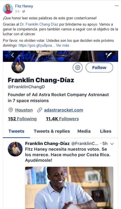 "Fitz Haney necesita nuestros votos. Se los merece. Hace mucho por Costa Rica. Ayudémosle!", escribió Chang en su cuenta de Twitter.