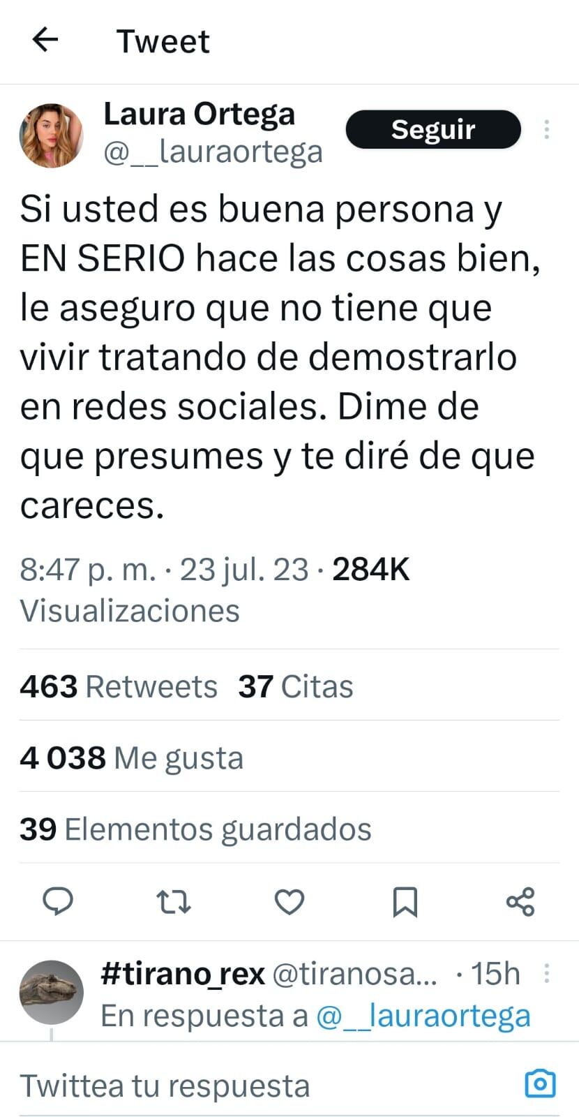 “Si usted es buena persona y EN SERIO hace las cosas bien, le aseguro que no tiene que vivir tratando de demostrarlo en redes sociales. Dime de qué presumes y te diré de qué careces”, publicó la modelo y cantante Laura Ortega, quien es hermana del novio de la periodista.