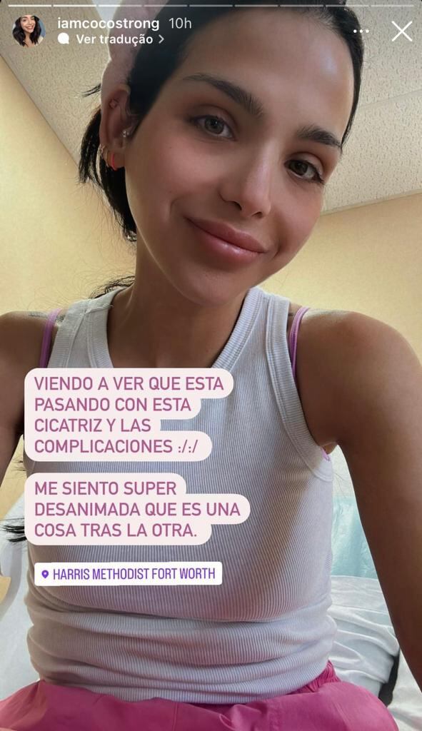 “Estamos teniendo problemas con la cicatriz. Aparentemente mi cuerpo está expulsando las puntadas de mi cirugía grande, es una complicación que estamos tratando de manejar. Ahorita viene mi cirujano”, contó en una historia de Instagram que compartió cuando todavía estaba en el hospital.