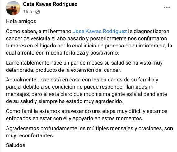 “Lamentablemente hace un par de meses su salud se ha visto muy deteriorada, producto de la extensión del cáncer. Actualmente José está en casa con los cuidados de su familia y pareja; debido a su condición no puede responder llamadas ni mensajes, pero él está claro de que muchísima gente está al pendiente de su salud y siempre ha estado muy agradecido”, publicó su hermana.