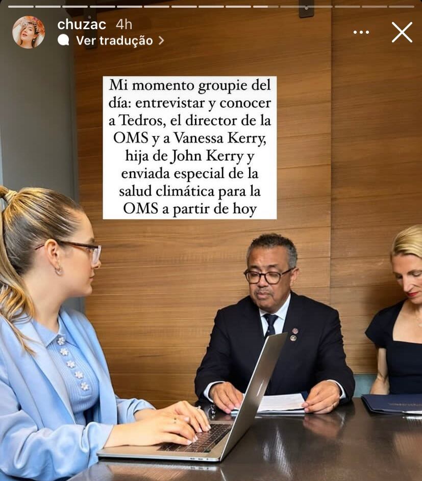 “Mi momento groupie del día: entrevistar y conocer a Tedros, el director de la OMS y a Vanessa Kerry, hija de John Kerry y enviada espacial de la salud climática para la OMS a partir de hoy (este jueves)”, escribió Prada en una fotografía que compartió en sus historias de Instagram mientras conversaba con ellos.