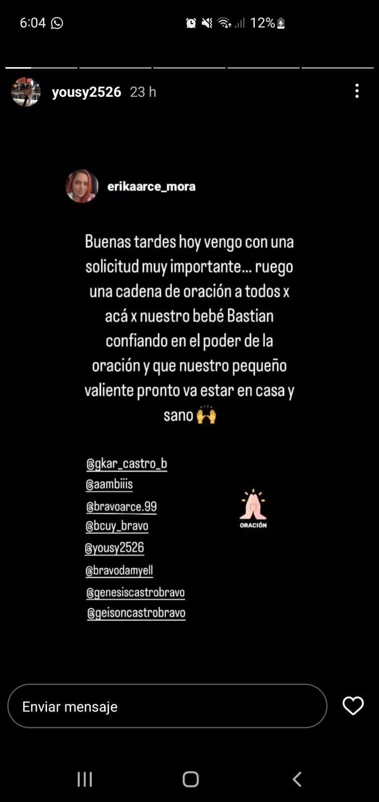 “Ruego una cadena de oración a todos por acá por nuestro bebé Bastian, confiando en el poder de la oración y que nuestro pequeño valiente pronto va a estar en casa y sano”, publicó Erika Arce Mora.