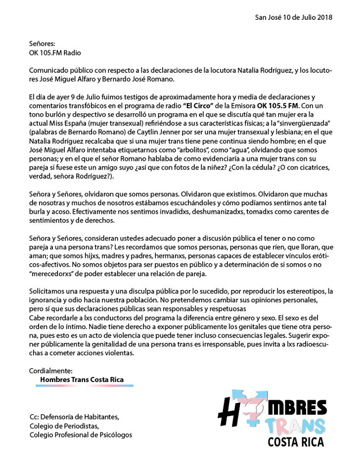 Es por eso que la organización Hombres trans de Costa Rica, que apoya a las personas es esta condición, pide que los locutores se disculpen públicamente, luego de que al parecer, hicieran una serie de bromas sobre la sexualidad de la nueva Miss España Ángela Ponce, quien nació con el sexo masculino, pero ahora es mujer.