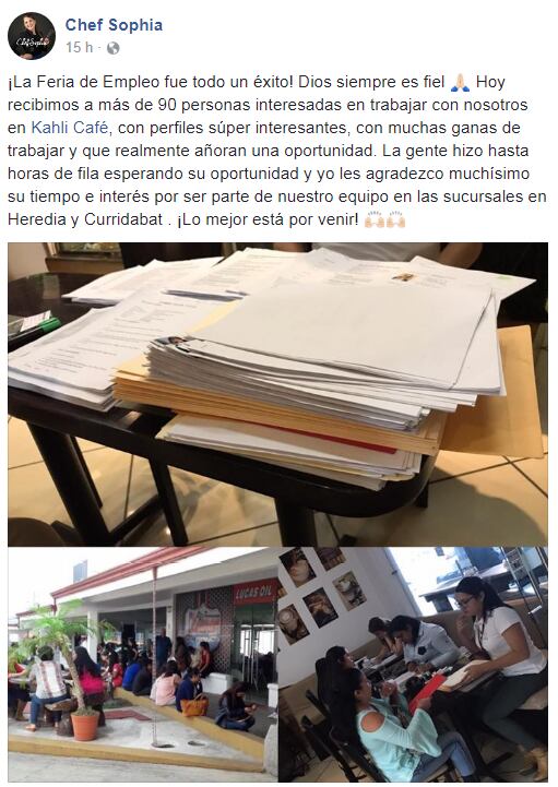 Por ello, la joven decidió organizar una feria de empleo este miércoles para llenar más de 20 plazas en distintos puestos para su nuevo negocio en San José y el local en Heredia.