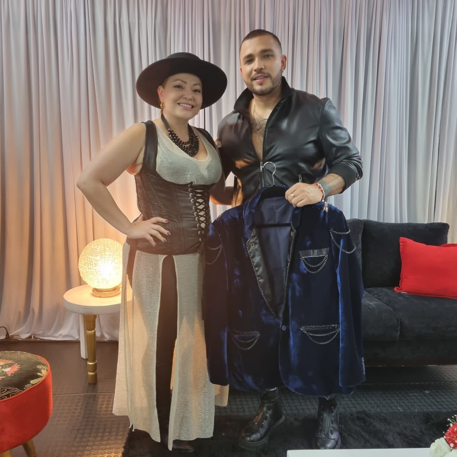 Minutos antes de salir al escenario, el domingo anterior en el Estadio Nacional, el intérprete de “Si me ven llorando” recibió la visita en su camerino de Priscilla Delgado, quien le hizo un ‘blazer’ completamente original y pensado en sus gustos.