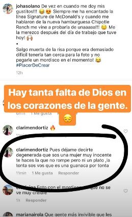 “Pues déjame decirte que sos una mujer muy inocente, te hacés la que no rompés un plato”, escribió el usuario en redes, a lo que Solano contestó: “Hay tanta falta de Dios en los corazones de la gente”.