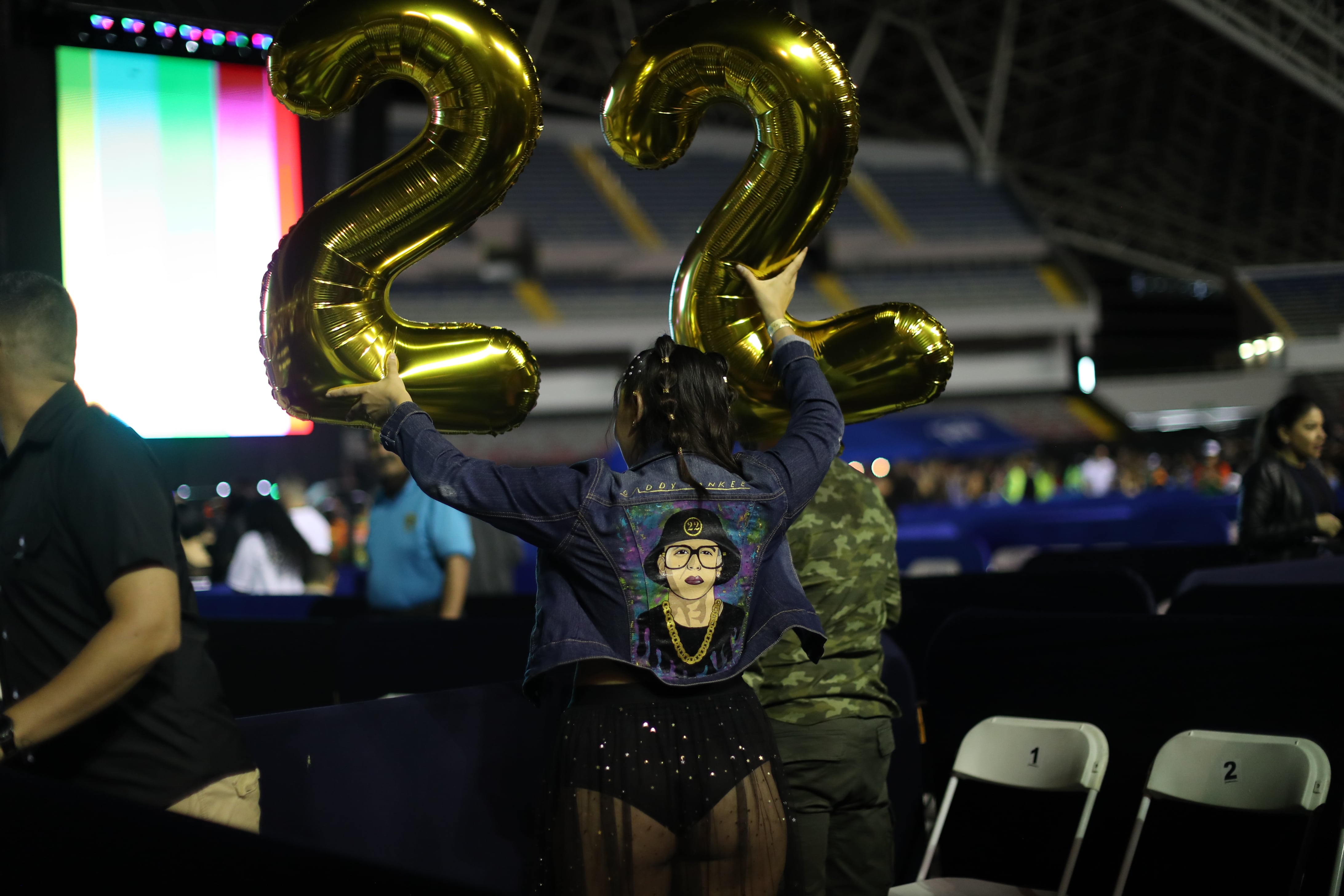 Con unos globos que sirvieron para confirmar su edad, de 22 años, y una jacket con el rostro de Daddy Yankee estampado fue como Belkis Silva Urbina llegó al concierto del ‘Big Boss’ para celebrar su cumpleaños.