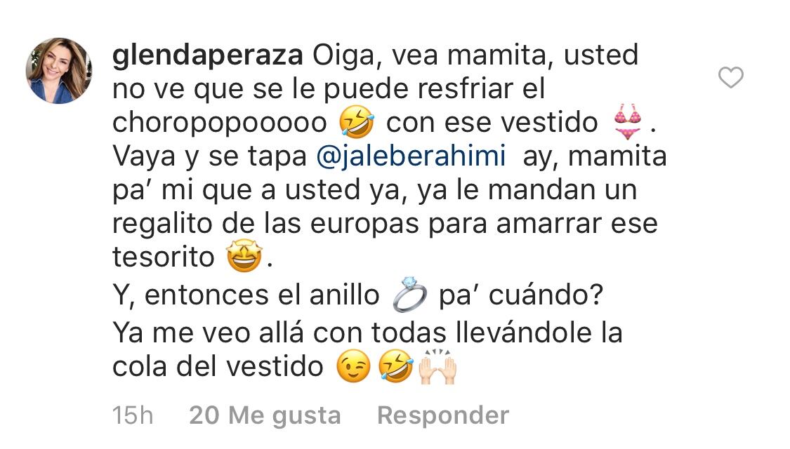Entre los comentarios de la foto, uno de los que más tuvo alcance fue el de la expresentadora Glenda Peraza, amiga íntima de la morenaza, quien afirmó que desde Europa le iban a mandar el anillo para amarrar el tesoro.