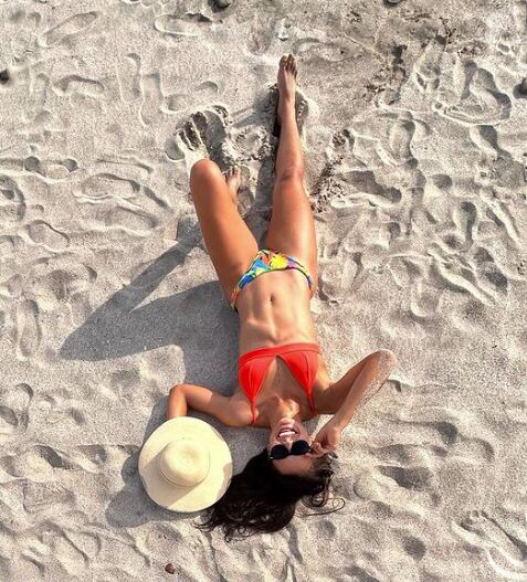La defensora manuda, de 25 años, se observa acostada en la playa con un hermoso bikini que resalta su hermoso y tonificado cuerpo.