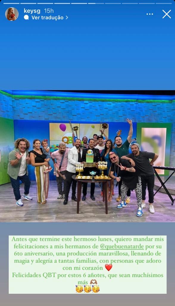 “Antes que termine este hermoso lunes, quiero mandar mis felicitaciones a mis hermanos de ¡Qué buena tarde! por su sexto aniversario, una producción maravillosa, llenando de magia y alegría a tantas familias, con personas que adoro con mi corazón. Felicidades ¡Qué buena tarde! por estos seis añotes, que sean muchísimos más”, escribió Sánchez en sus historias en Instagram.