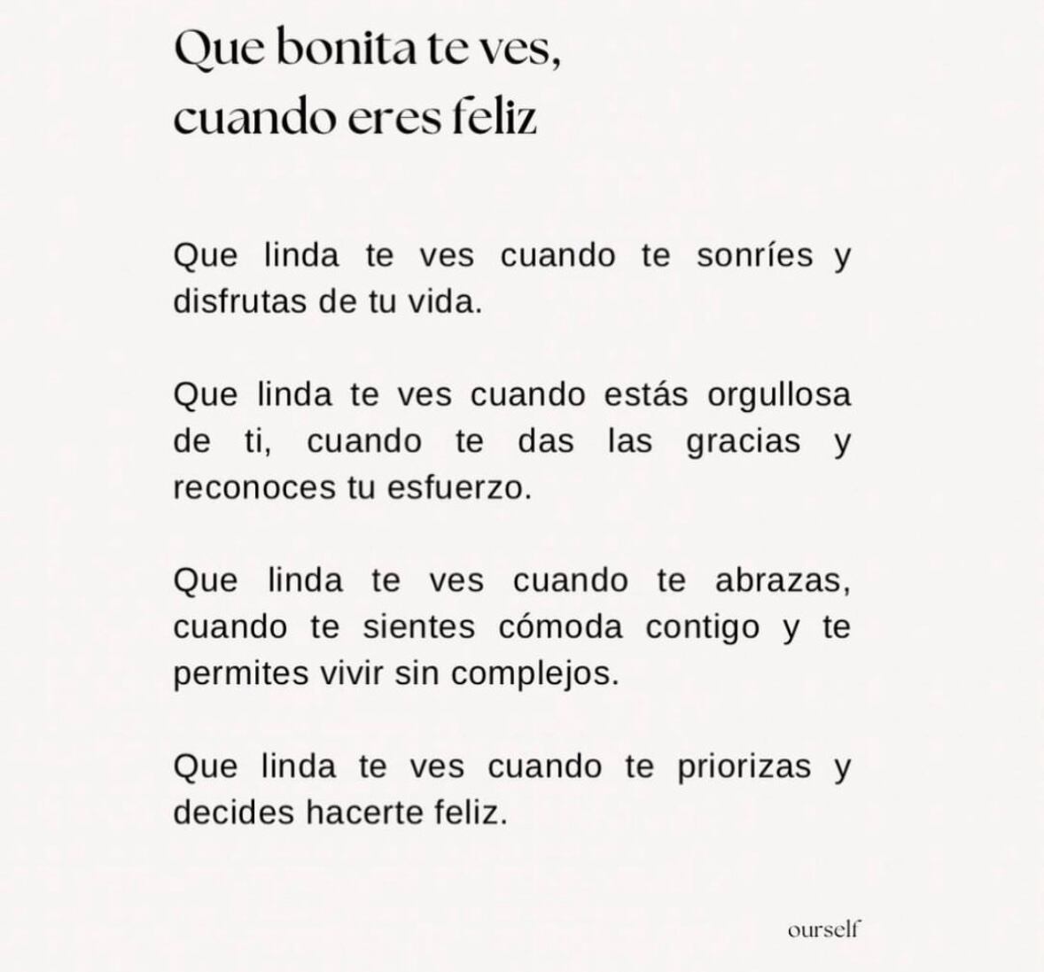 La comunicadora por medio de sus historias de Instagram subió una imagen que decía: “Que bonita te ves, cuando eres feliz, cuando sonríes y disfrutas de tu vida, cuando estás orgullosa de ti, cuando te das las gracias y reconoces tu esfuerzo, cuando te abrazas, cuando te sientes cómoda contigo y te permites vivir sin complejos, cuando te das prioridad y decides hacerte feliz”.