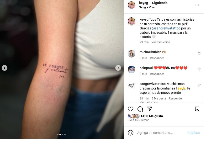 Keylita se tatuó en uno de sus brazos la frase bíblica de Josué, capítulo 1, versículo nueve, que dice: “Sé fuerte y valiente” y tras esa oración escribió J 1:9, en referencia al libro bíblico.