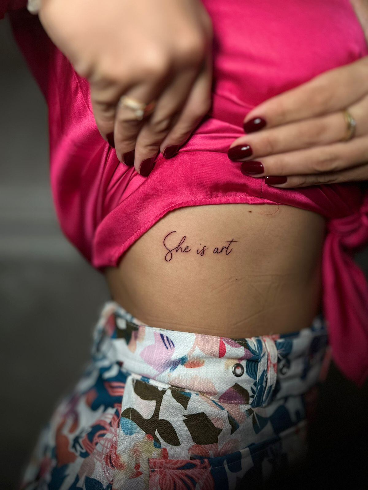 El tercer tatuaje que se hizo el mismo día que los otros, lo tiene a un costado del abdomen, por las costillas. Allí se plasmó para siempre la frase ‘She is art’, que en español significa ‘Ella es arte’.