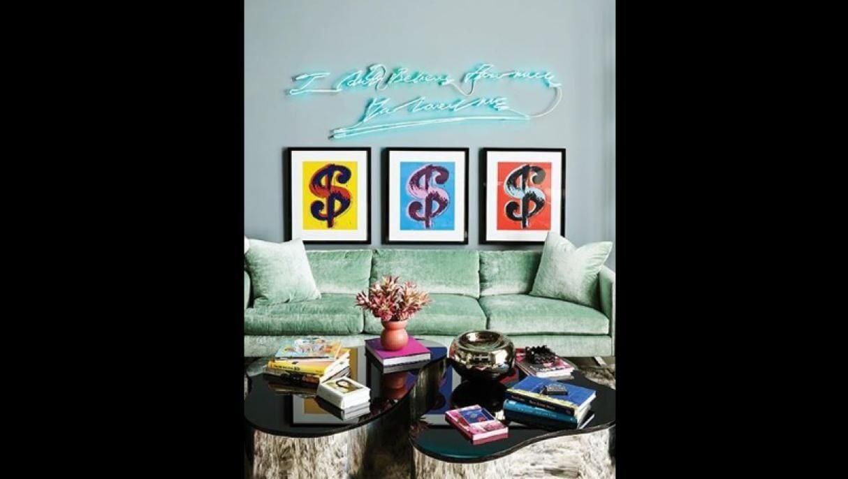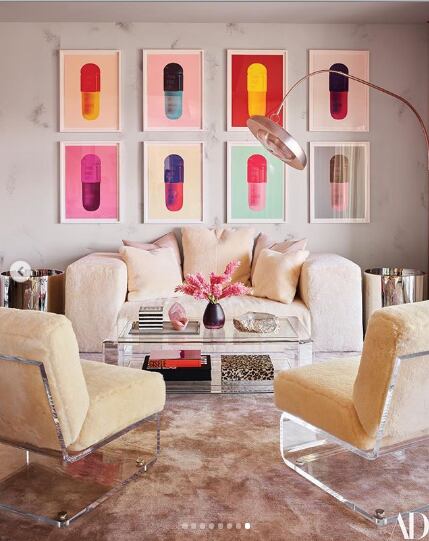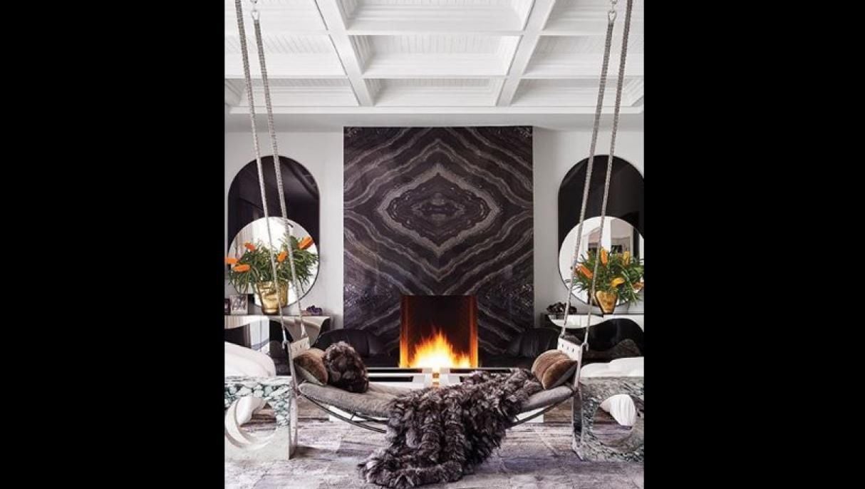 La zona de descanso de la casa, no es tan llamativa, ni en color rosa; tiene un espacio maximalista y una fogata digital.