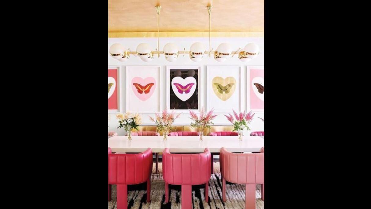 En relación al comedor de la casa, tiene un techo de pan de oro y las sillas están pintadas de los mismos colores de los labiales y las sombras Kylie Cosmetics.