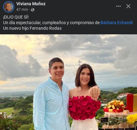 “¡Dijo que sí! Un día espectacular, cumpleaños y compromiso de Bárbara Echandi. Un nuevo hijo Fernando Rodas”, escribió Viviana en su Facebook junto a una fotografía de la feliz y enamorada pareja.