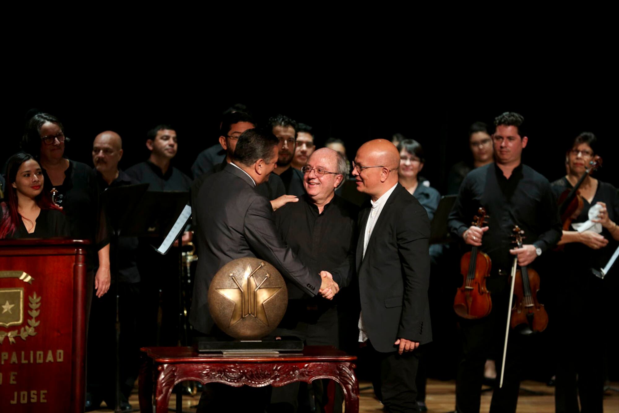 El director invitado de la Sinfónica, Eddie Mora y el concertino José Aurelio Castillo fueron los que recibieron la escultura en forma de estrella, hecha por el artista tico Jorge Jiménez Deredia, que los oficializa como los grandes homenajeados del evento.
