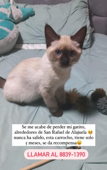 Ella contó que se le perdió por el barrio Corazón de Jesús, en San Rafael de Alajuela, y que lo que más le preocupa es que su gatito necesita tomar una medicina especial.