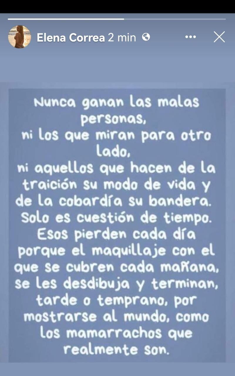 “Nunca ganan las malas personas, ni los que miran para otro lado. Ni aquellos que hacen de la traición su modo de vida y de la cobardía su bandera. Solo es cuestión de tiempo. Esos pierden cada día porque el maquillaje con el que se cubren cada mañana los desdibuja y terminan, tarde o temprano, por mostrarse al mundo como los mamarrachos que realmente son”, afirmó, minutos después de que se hiciera pública la denuncia, con una imagen en sus historias de Instagram.