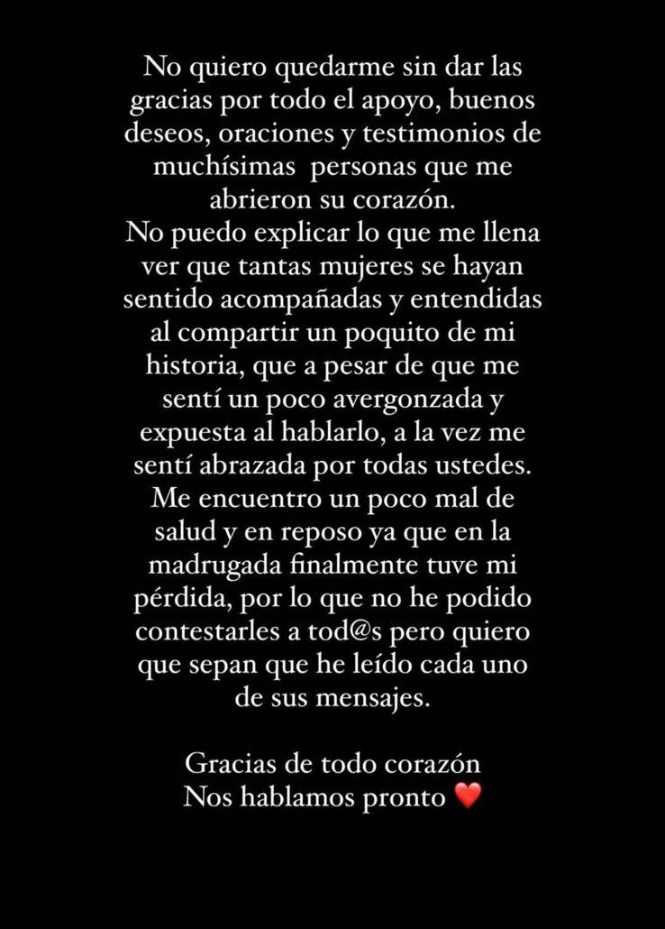 La modelo, este miércoles en la noche, también decidió compartir con sus seguidores en redes sociales que ya tuvo la pérdida.