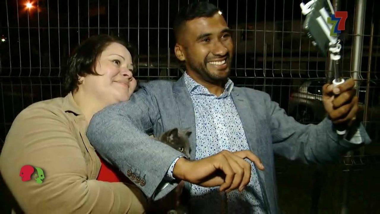 El comunicador tuvo que tomarse un selfi con un gato, el animal que más miedo le da, pero al hacerlo se echó a la bolsa 250 mil colones, los cuales prometió que usaría para ayudar a remodelar el parque de Bribrí, en Talamanca, de donde es oriundo.
