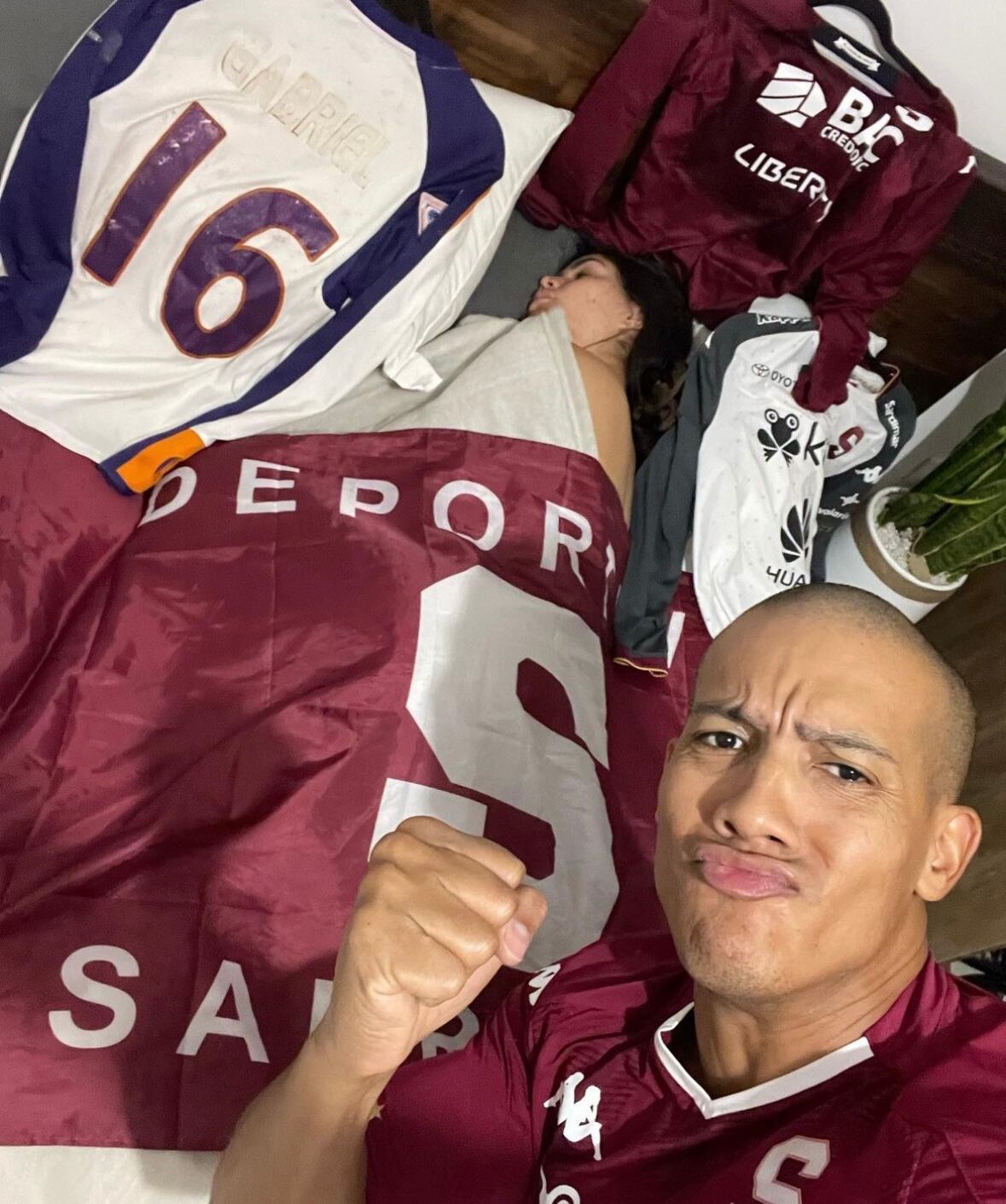 Mediante sus redes sociales, el influencer compartió un video y unas fotografías de su esposa durmiendo, pero con camisetas y una bandera como cobija del conjunto morado.