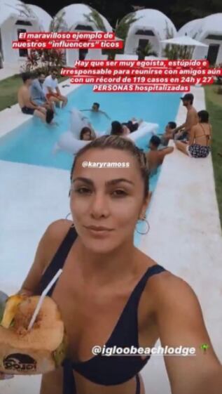 La exMiss Costa Rica compartió imágenes de lo bien que lo estaba pasando en unas cabinas en Manuel Antonio, haciendo caso omiso a las recomendaciones del Ministerio de Salud, primero de guardar las burbujas sociales y segundo, de quedarse en casita porque lo que estamos atravesando no es jugando.