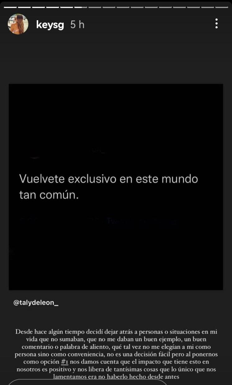 “Desde hace algún tiempo decidí dejar atrás a personas o situaciones en mi vida que no sumaban, que no me daban un buen ejemplo, un buen comentario o palabra de aliento, que tal vez no me elegían a mí como persona sino por conveniencia. No es una decisión fácil, pero al ponernos como opción #1 nos damos cuenta que el impacto que tiene esto en nosotros es positivo y nos libera de tantísimas cosas que lo único que nos lamentamos es no haberlo hecho desde antes”, escribió.