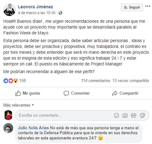 “No está de más que esa persona tenga a mano el contacto de la Defensa Pública para que le oriente en sus derechos laborales en esta apasionante aventura 24/7”, escribió un usuario identificado como Julio Solís.