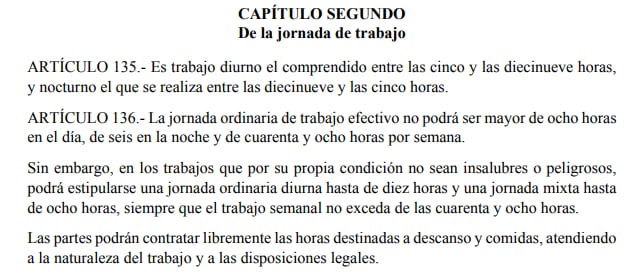 Según lo establece la legislación nacional, la jornada diurna está comprendida entre las cinco de la mañana y las siete de la noche, pero no deben ser más de 48 horas a la semana.
